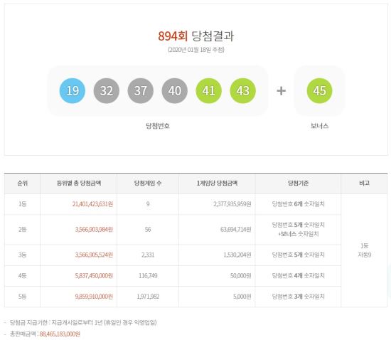 지난 18일 오후 MBC 생중계로 공개된 894회 로또 당첨 번호는 19 32 37 40 41 43이다. 2등 보너스 번호는 45다.