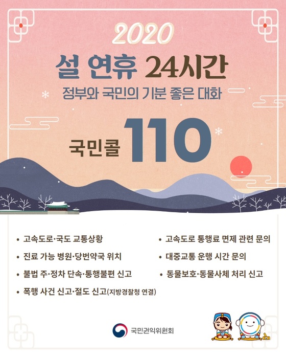 국민권익위원회는 설 연휴에도 국민콜 ☎110(정부민원안내)을 통해 병원·약국 정보와 교통상황 등 생활안내 및 행정기관 관련 민원상담이 24시간 가능하다고 24일 밝혔다.