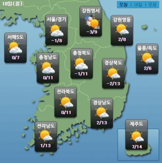 낮 예상 최고기온은 △서울 9도 △대전 11도 △광주 13도 △부산 13도 △대구 11도 △춘천 9도 △제주도 14도 등이다.