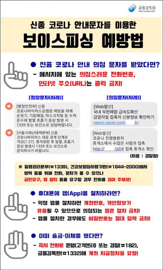 또한 보건당국을 가장해 검사비용과 치료비용 등 금전을 요구하거나 자영업자들을 대상으로 확진자 등을 사칭해 금전을 요구하는 방식의 보이스피싱도 잇따르고 있다.