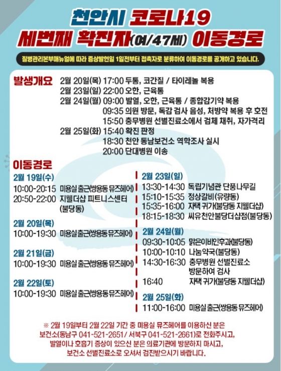 세 번째 확진자는 47세 여성으로 지난 19일부터 25일까지 쌍용동에 위치한 뮤즈헤어에서 근무했으며 거주지는 불당동으로 전해졌다.