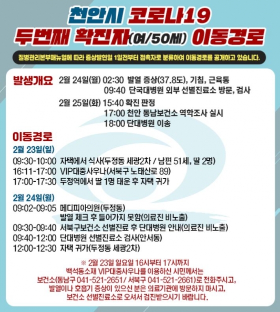 이에 충남도는 26일 추가 확진자 2명에 대한 동선을 공개했다. 천안시 두 번째 확진자는 50세 여성으로 23일 두정동에 위치한 자택에서 머물다가 서북구에 위치한 VIP 대중사우나를 방문했다. 이후 두정역을 거친 후 자택으로 귀가했다.