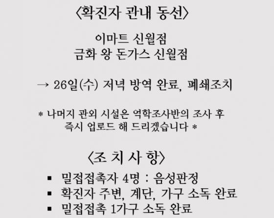 이후 27일 양천구청 측은 블로그를 통해 확진자 동선을 공개했다. 양천구청에 따르면 이 확진자는 이마트 신월점, 금화 왕 돈가스 신월점을 방문했다.