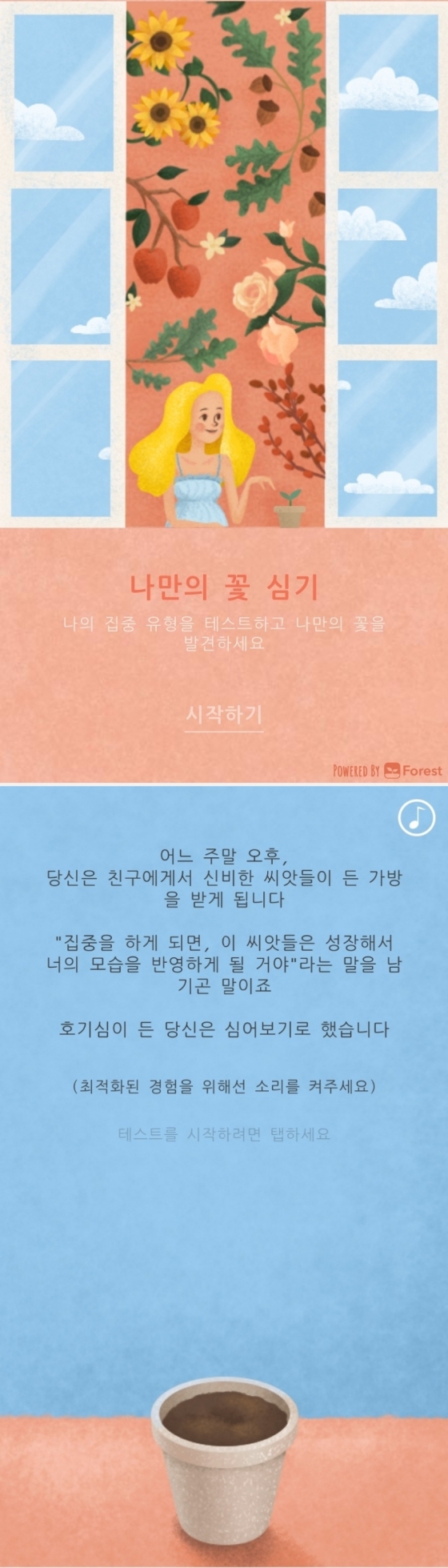 테스트를 시작하면 음악과 함께 씨앗을 선택하라는 질문이 나온다. 씨앗을 선택하면 자신이 듣고 싶은 음악이나 책을 선택하라는 질문이 뒤를 잇는다.