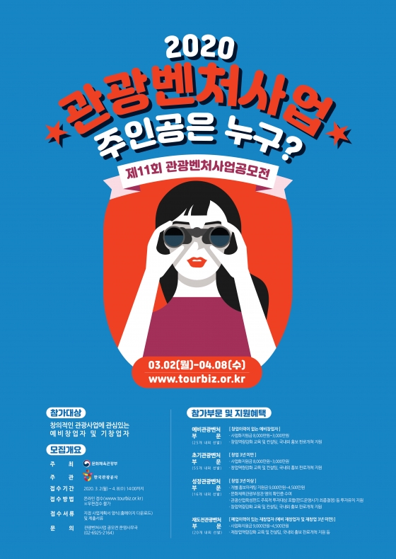 문화체육관광부(장관 박양우)와 한국관광공사(사장 안영배)는 유망한 관광벤처를 발굴하고 육성하기 위해 창의적인 사업 아이디어를 보유한 예비창업자와 창업기업을 대상으로 ‘제11회 관광벤처사업 공모전’을 진행한다.