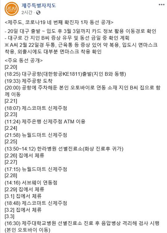 제주도청은 일차적으로 확진자 진술에 기초한 것으로 해당 동선을 공개했고 추후 변경될 수 있다고 덧붙였다.