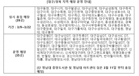 휴점 대상 매장은 대구와 경북 지역 내 운영 매장 74 개 중 39곳 매장으로, 이 중 9개 매장은 지난 2월말부터 순차적으로 진행해오던 휴점이 연장된다.