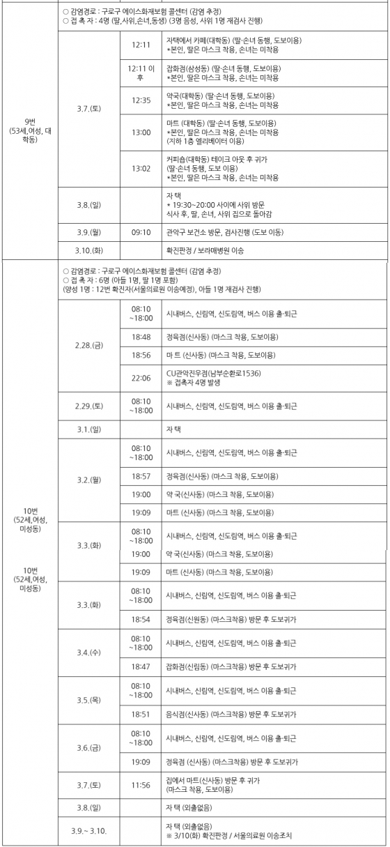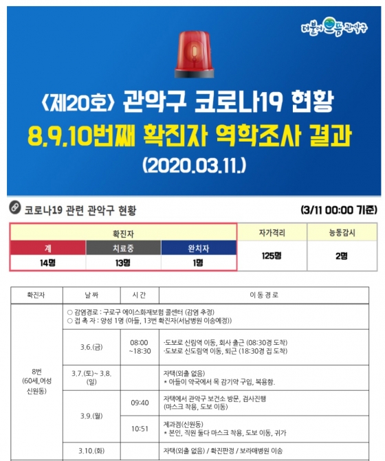 서울 관악구청이 신종 코로나바이러스 감염증(코로나19) 확진 판정을 받은 8, 9, 10번 확진자의 동선을 공개했다.