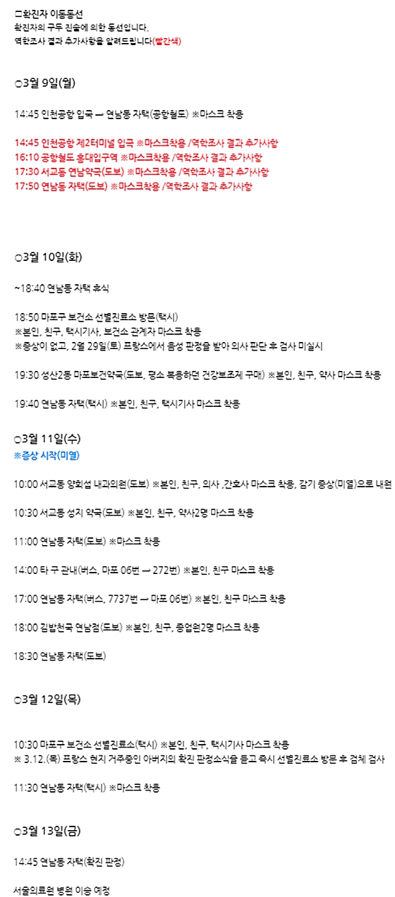 확진자 A씨는 지난 9일 오후 2시 45분 인천공항으로 국내 입국하여 공항철도를 타고 연남동의 자택으로 이동했다. 이날 A씨는 인천공항 제2터미널, 홍대입구역, 서교동 연남약국을 방문한 것으로 확인됐다.
