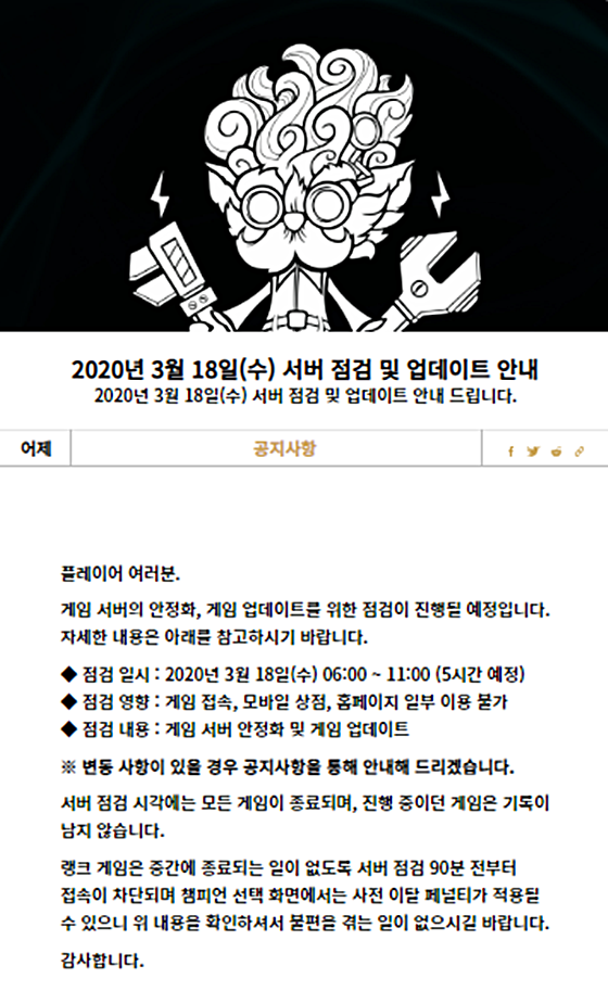 리그 오브 레전드 제작사 라이엇게임즈코리아는 공식 홈페이지를 통해 "게임 서버의 안정화, 게임 업데이트를 위한 점검이 진행될 예정"이라고 공지했다.