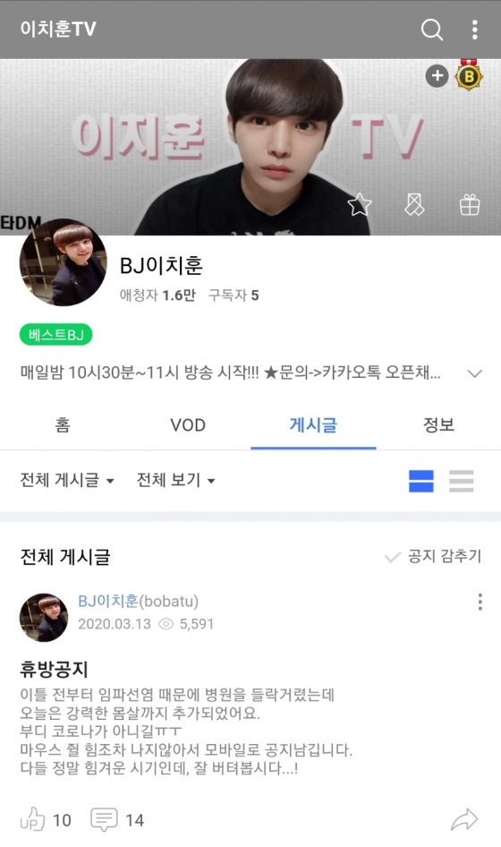 이치훈은 지난 13일 자신이 운영했던 아프리카TV 게시글에 "이틀 전부터 임파선 염 때문에 병원을 들락거렸다. 오늘은 강력한 몸살까지 추가되었다. 부디 코로나가 아니길. 마우스 쥘 힘조차 나지 않아서 모바일로 공지 남긴다. 다들 정말 힘겨운 시기인데, 잘 버텨보자"라고 전해 안타까움을 유발했다.