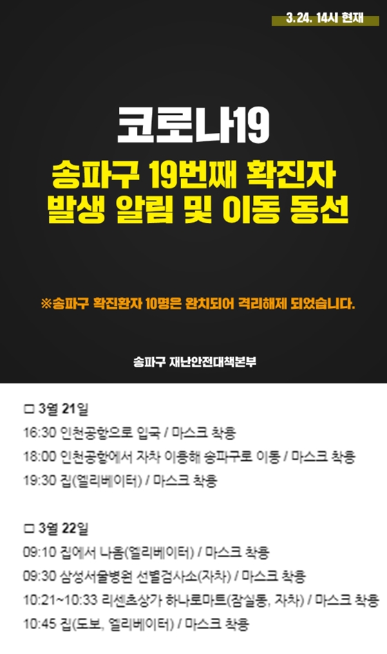 송파구청은 24일 공식 홈페이지를 통해 송파구 코로나19 19번 확진자 A씨는 잠실2동에 거주하는 23세 여성으로 지난 21일 미국에서 입국했다고 밝혔다.