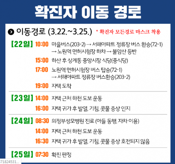 확진자 A씨는 지난 22일 203-2번 마을 버스를 타고 서해아파트 정류장에서 72-1번 버스로 환승하여 노원역의 면허시험장에 하차 후 불암산을 등반했다. 이후 하산하여 상계동 중앙시장 내의 중식당에서 식사를 마쳤다. 식사 후 72-1번 버스 탑승, 서해아파트 정류장에서 203-2번 버스로 환승하여 자택에 귀가한 것으로 확인됐다..