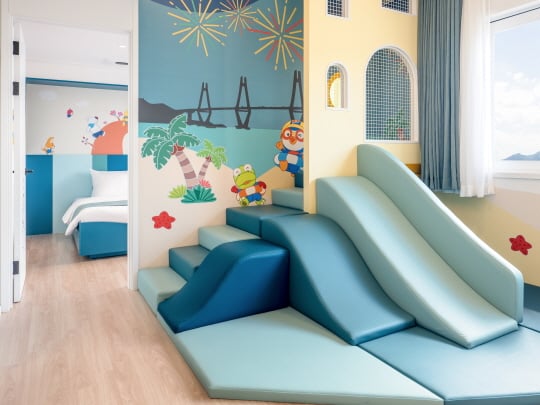한화리조트는 거제 벨버디어와 설악 쏘라노, 대천 파로스, 용인 베잔송, 경주의 뽀로로 객실을 ‘아이 안심 클린존(Kids Clean Zone)’으로 지정했다. 전문 방역업체가 객실뿐만 아니라 객실 내 미끄럼틀, 블록 놀이 공간, 안전매트 등도 세심하게 방역해 아이들이 즐겁고 안전하게 즐길 수 있도록 했다.