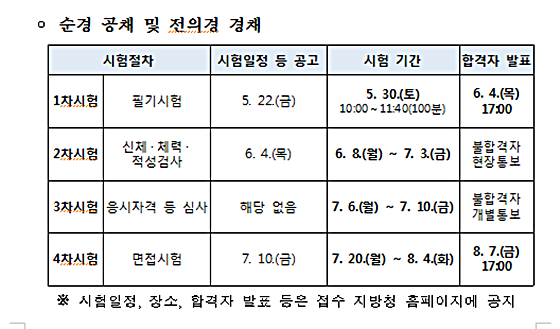 경찰청 공고에 따르면 1차 필기 시험은 오는 5월 30일 오전 10시부터 치러진다. 시험 일정 관련 공고는 그보다 앞선 5월 22일 공개될 예정이다. 필기 시험 합격자는 6월 4일 오후 5시에 발표된다.