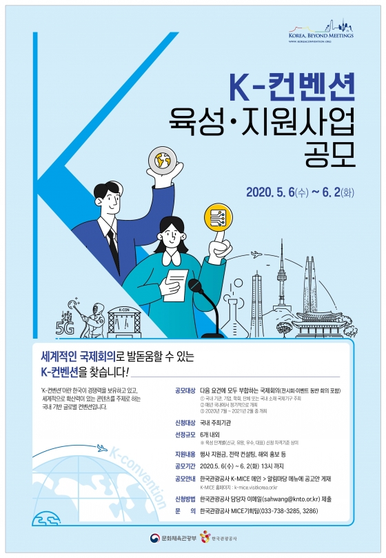 문화체육관광부(장관 박양우)와 한국관광공사(사장 안영배)는 국내 기반 국제회의의 글로벌화를 위한 ‘K-컨벤션 육성·지원 사업’ 공모를 5월 6일~6월 2일 기간 동안 실시한다. 이번 공모는 4차 산업혁명, 한류 및 문화산업, K-방역 및 의학 등 다양한 주제 분야에서 성장이 유망한 국제회의를 발굴해 글로벌 마이스로 육성함으로써, 국제회의 강국으로서 한국의 이미지 제고, 안정적인 국제회의 수요 창출 및 업계 성장기반 마련을 목적으로 한다.