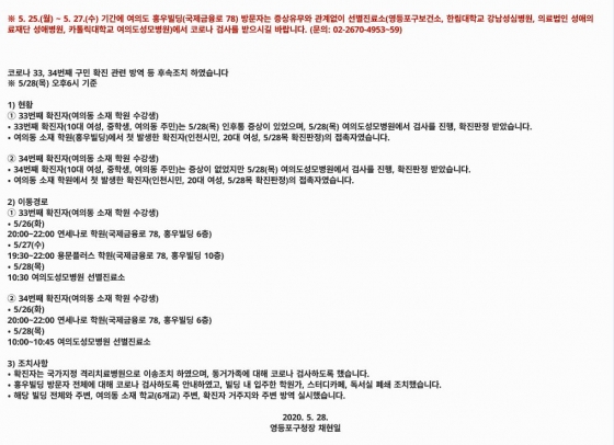 영등포구청이 신종 코로나바이러스 감염증(코로나19) 33번, 34번 환자의 이동 동선을 공개했다.