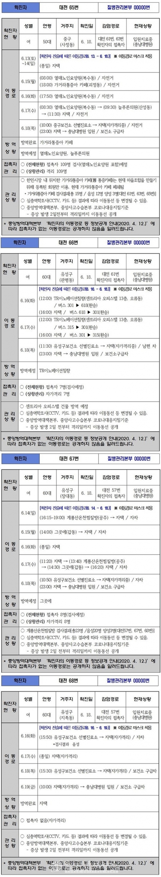 대전시청이 신종 코로나바이러스 감염증(코로나19) 65~68번째 확진자의 동선을 공개했다.