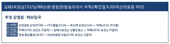 A씨는 생림면에 거주하는 방글라데시 국적인으로 지난 18일 오전 7시 인천공항에 도착했다. 이후 오전 10시 16분 출발 KTX에 탑승하여 12시 42분 부산역에 도착했으며 자가용을 이용해 자택에 도착했다.