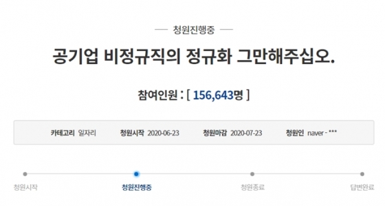 지난 23일 청와대 국민청원 게시판에는 '공기업 비정규직의 정규화 그만해주십시오'라는 제목의 청원글이 게재됐다.