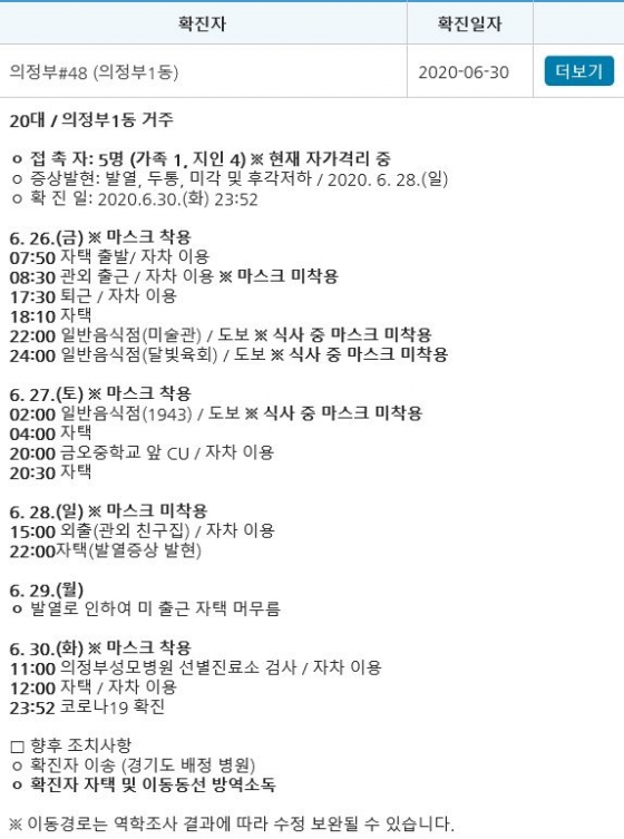 의정부시청이 신종 코로나바이러스 감염증(코로나19) 48번 확진자 동선을 공개했다.