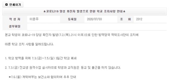 3일 전교생 원격수업 실시로 학생 및 교직원은 일절 등교·출근하지 않는다. 오는 6일 개학 여부 역시 보건소와 협의 후 안내될 예정이다.