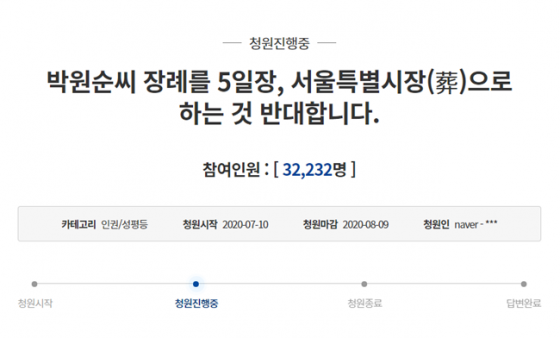 청원인 A씨는 "박원순씨가 사망하는 바람에 성추행 의혹은 수사도 하지 못한 채 종결되었지만 그렇다고 그게 떳떳한 죽음이라 확신할 수 있는가"라고 물으며 "성추행 의혹으로 자살에 이른 유명 정치인의 화려한 5일장을 언론에서 국민이 지켜봐야 하나요?"라고 말했다.