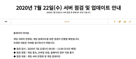 리그 오브 레전드 제작사 라이엇 게임즈는 공식 홈페이지를 통해 "게임 서버의 안정화, 게임 업데이트를 위한 점검이 진행될 예정"이라고 전했다.