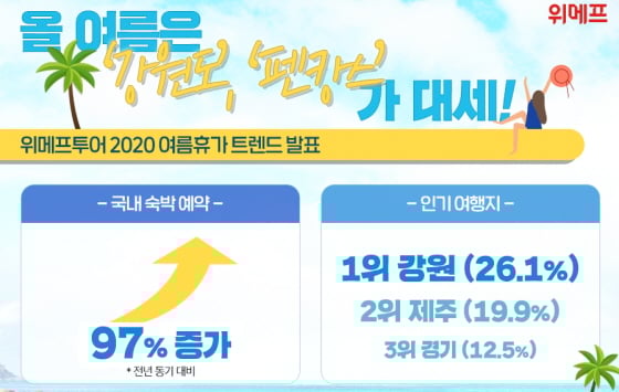 위메프에 따르면 7~8월 국내 숙박 예약이 지난해와 비교해 97% 증가했다(22일기준)고 밝혔다. 인기 숙소 유형과 여행지는 ‘펜션’, ‘강원도’가 뽑혔다.