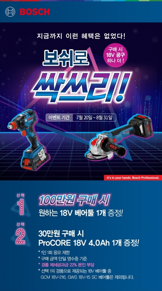 보쉬 전동공구 사업부가 18V 전문가용 전동공구 사용자들이 늘어남에 따라 100만원 구매시 18V본체 제품을 하나 더 무상으로 제공하는 '보쉬로 싹쓰리' 특별 이벤트를 8월말까지 한 달간 진행한다고 3일 밝혔다.