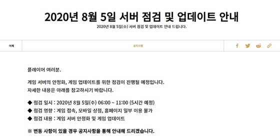 이번 점검은 오전 6시부터 오전 11시까지 5시간 동안 진행된다. 점검 동안 게임 접속, 모바일 상점, 일부 홈페이지 이용이 제한된다.