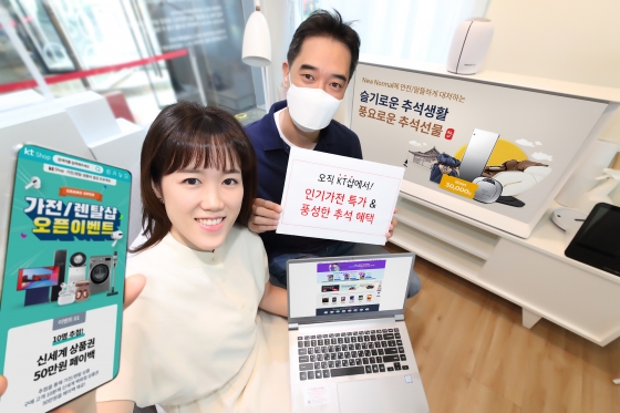 KT샵은 민족 대 명절을 맞아 유·무선 상품 구매 시 추가 혜택을 제공하는 ‘슬기로운 추석생활’ 기획전을 10월 4일까지 진행한다. ‘1시간 배송’ 서비스를 이용해 핸드폰을 개통한 고객을 대상으로 ▲트롬 스타일러 ▲코드제로 로봇청소기 ▲DIOS 식기세척기 등 ‘위생’에 도움되는 가전을 추첨을 통해 선물한다. 선착순 150명에게는 ▲이마트 상품권 3만원권을 증정한다.