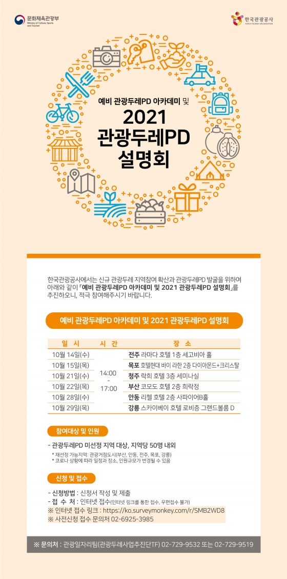 문화체육관광부(장관 박양우)와 한국관광공사(사장 안영배, 이하 공사)는 10월 14일부터 10월 29일까지 전주, 목포, 부산 등 6개 지역에서‘예비 관광두레PD 아카데미 및 2021 관광두레PD 선발 설명회’를 개최한다.