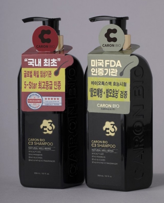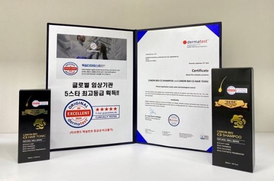 주식회사 카론바이오(대표 조진형)는 “지난 9월 24일 카론바이오의 C3샴푸와 C3헤어토닉이 독일 Dermatest(더마테스트)사의 임상시험에서 최고의 안전성 및 내약성(임상피험자가 부작용이나 불편감을 견뎌낼 수 있는 정도), 효능을 보증하는 오성급 임상 인장(Excellent 5-STAR)을 국내 최초로 동시에 획득했다”고 20일 밝혔다.