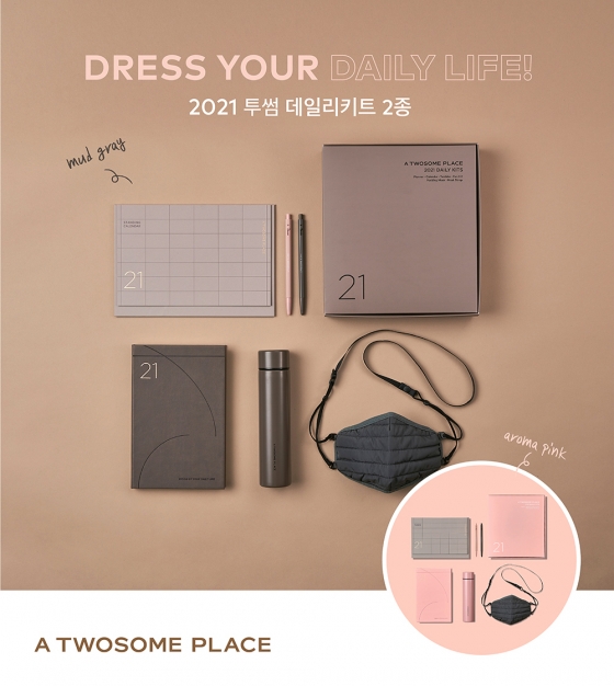 투썸플레이스 ‘2021 데일리키트’는 투썸의 원두 이원화를 모티브로 한 세련된 색감과 실속 있는 구성이 특징이다. 아로마노트의 화사한 느낌을 표현한 ‘아로마핑크’와 블랙그라운드의 묵직하고 진한 풍미를 표현한 ‘머드그레이’ 두 가지 컬러로 선보여, 고객이 취향과 라이프스타일에 맞춰 선택 가능하다.