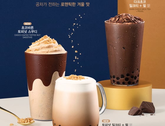 겨울 시즌 메뉴는 ‘로맨틱한 겨울 맛’을 테마로 달콤하고 진한 맛을 느낄 수 있는 '토피넛 밀크티+펄', '초코바른 토피넛 스무디', '다크초코 밀크티+펄' 총 3종이다. 특히 토피넛 2종 신메뉴는 겨울 시즌 대표 아이템으로 자리 잡은 '토피넛'을 공차만의 스타일로 해석한 메뉴라는 점에서 주목할 만하다. 다크초코 신메뉴는 공차의 베스트셀러 '초콜렛 밀크티'를 더욱 진하게 즐길 수 있어 또다시 초코 덕후들의 취향을 저격할 것으로 보인다.