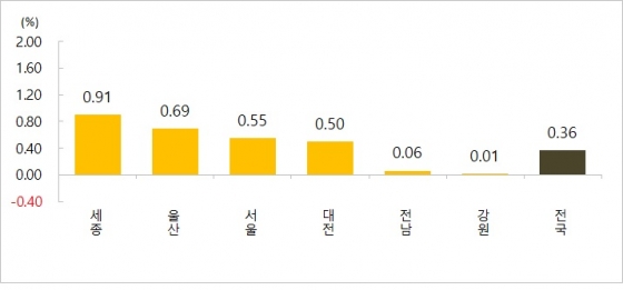광역시 이외 지역도 모두 전세가가 상승했는데 최근 주목받고 있는 세종은 0.91%를 기록하였다.