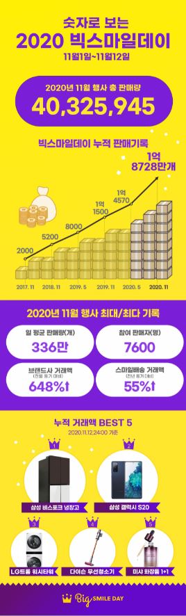 이는 3500만여 개가 팔렸던 지난해 11월 행사 보다도 15% 늘어난 것이며 빅스마일데이 행사 역대 최다 판매량으로 기록됐다. 2017년 첫 행사 이후 6회 동안 빅스마일데이 행사를 통해 판매한 제품 수는 모두 1억8728만개에 달한다.