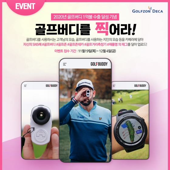 골프 거리측정기 전문기업 골프존데카(대표이사 정주명)가 12월 4일(금)까지 글로벌 골프 거리측정기 브랜드 ‘골프버디’의 누적 수출액 1억 불 돌파 기념 감사 이벤트로 ‘골프버디를 찍어라!’를 진행한다고 19일 밝혔다.