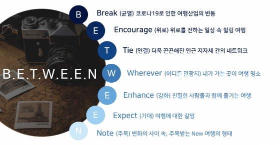 공사는 이런 2021년도 국내관광 현상을 ‘B.E.T.W.E.E.N.’ 7개 키워드, 즉 △균열(Break), △위로(Encourage), △연결(Tie), △어디든(Wherever), △강화(Enhance), △기대(Expect), △주목(Note)으로 정리했다.