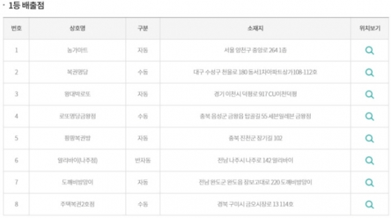 지역별 1등 당첨자는 충북 2명, 전남 2명, 서울, 대구, 경기, 경북에서 각각 1명씩이다.