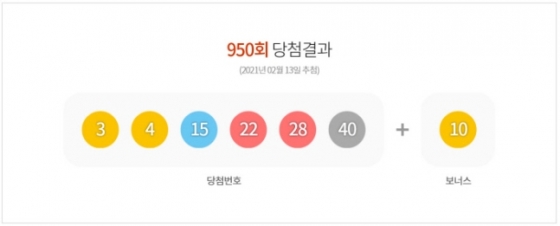 13일 추첨한 제950회 로또복권 1등 당첨번호는 '3, 4, 15, 22, 28, 40'으로 결정됐다. 2등 보너스 번호는 '10'이다.