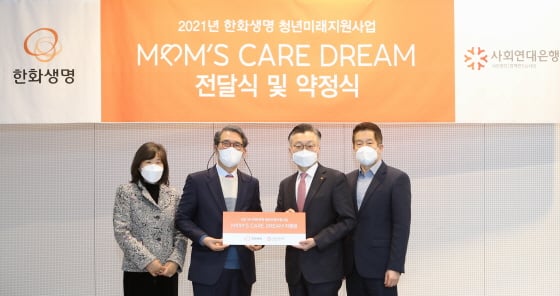 한화생명은 사회연대은행과 함께 24일 오전 사회연대은행 생명보험홀에서 ‘맘스케어 DRAEM 전달식 및 약정식’을 실시했다. 행사에는 한화생명 김영식 홍보실장과 사회연대은행 김용덕 대표상임이사, 그리고 수혜 청년 16명이 참석했다.