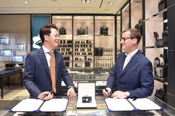 조좌진 롯데카드 대표이사와 에릭 에더(Eric Eder) 몽블랑 코리아 지사장은 20일 오전 서울 소공동에 위치한 롯데백화점 본점 에비뉴엘 2층 몽블랑 부티크 매장에서 협약식을 가졌다.
