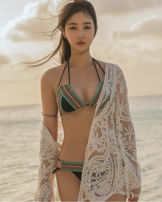 사진 속 임지우는 노을이 지는 해변에서 비키니를 입은 채 카메라를 응시하고 있다.