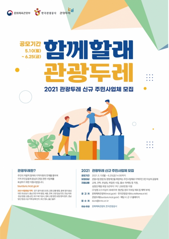 한국관광공사(사장 안영배)와 문화체육관광부(장관 황희)는 지역관광을 지속적으로 활성화하기 위해 5월 10일(월)부터 6월 25일(금)까지 2021년 관광두레 신규 주민사업체를 모집한다.