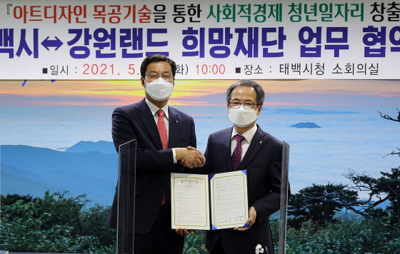 25일 진행된 이번 협약은 고용노동부에서 실시한 '지역·산업 맞춤형 일자리 창출지원사업' 공모에 태백시와 강원랜드희망재단, 강원랜드 사내벤처'우드리즘'이 함께 계획한 '아트디자인 목공기술을 통한 사회적경제 청년 일자리 창출사업'이 선정돼 진행됐다.