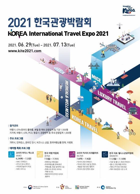 문화체육관광부(장관 황희)와 한국관광공사(사장 안영배)는 코로나 속 어려움을 겪고 있는 한국 관광업계의 해외 판로 개척을 지원하고자 오는 6월 29일부터 7월 13일까지 '한국관광박람회(Korea International Travel Expo)'를 온라인 전용 누리집과 오프라인에서 개최한다.