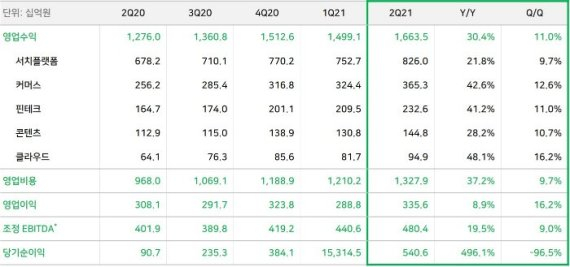 사업 부문별 매출을 보면 ▲서치플랫폼 8260억원 ▲커머스 3653억원 ▲핀테크 2326억원 ▲콘텐츠 1448억원 ▲클라우드 949억원 순으로 집계됐다.