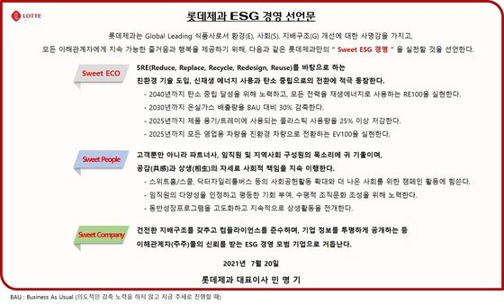 롯데제과가 ESG(환경, 사회, 지배구조) 경영 실천을 위해 'Sweet(스위트) ESG 경영' 방침을 밝혔다. 롯데제과는 21일 서울 영등포구 양평동 본사에서 ESG경영 선포식을 가지고 이같이 밝혔다.